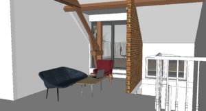 Le Permis d’Urbanisme est en attente d’être délivré pour ce projet. Les demandeurs souhaitent créer une lucarne d’accès à la nouvelle terrasse. La terrasse est dessinée avec les dimensions les plus grandes possible par rapport aux demandes de la Commune de Schaerbeek. La structure de la toiture plate sera remplacée pour aménager cette nouvelle terrasse avec des bacs de plante.