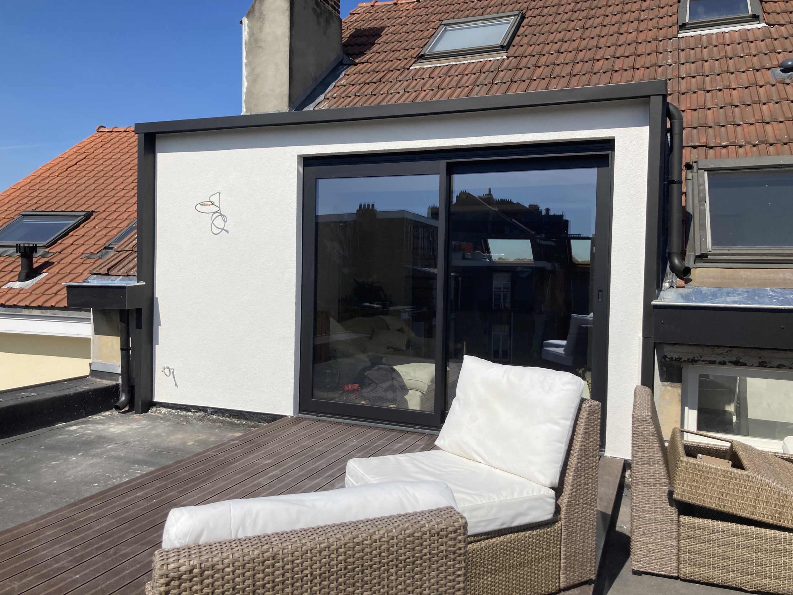 - L’aménagement d’une terrasse sur la toiture plate en façade arrière par laquelle on accède à l’aide du nouveau châssis coulissant de la lucarne. Le duplex est en retrait par rapport à la façade arrière, ce qui offre une grande toiture plate inaccessible pour le moment. L’envie du maître de l’ouvrage est d’ouvrir la lucarne vers la terrasse afin d’accéder à cette toiture plate et d’y aménager une terrasse accessible sur plots de plus ou moins 10 mètres carrés. Une barrière végétale sera mise en place entre la terrasse et les garde-corps afin de rendre inaccessibles les reculs : nous disposons des bacs de plantes, plus hauts de 40 cm par rapport à la nouvelle terrasse.
